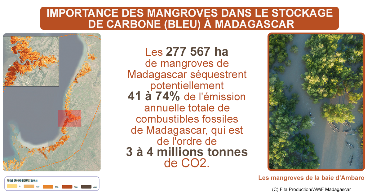 Les points chauds du carbone bleu comprennent la baie d’Ambaro et Mahajamba au nord-ouest de Madagascar avec des quantités particulièrement élevées de biomasse de mangrove au-dessus du sol. Les estimations récentes du stock total de carbone pour l’écosystème de mangrove dans les baies d’Ambaro-Ambanja varient de 126 à 571 t C ha-1, avec une moyenne globale de 356 t C ha-1 (Jones et al., 2015).